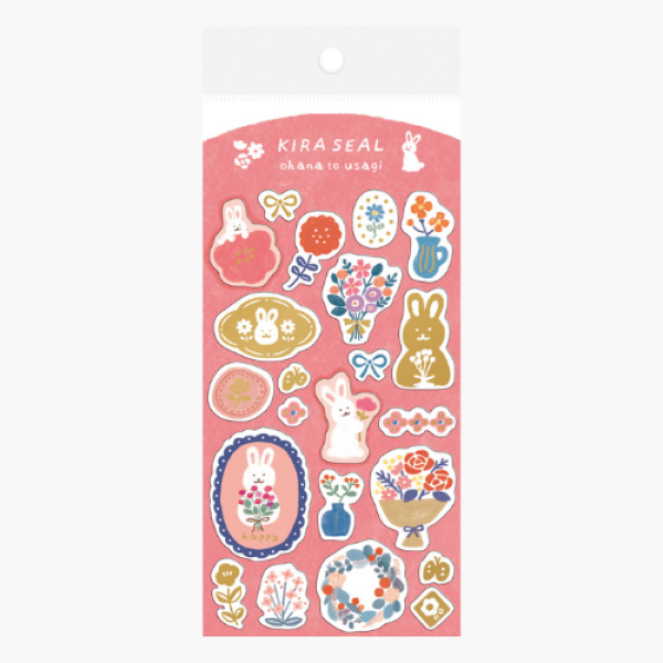 Suloinen tarra-arkki, jonka kuvituksessa on kukkasia ja pupuja. Tarra-arkin kuvissa on kauniit kultafolioidut yksityiskohdat. Arkin koko: 140 mm x 80 mm. Arkin materiaali: japanilainen riisipaperi.